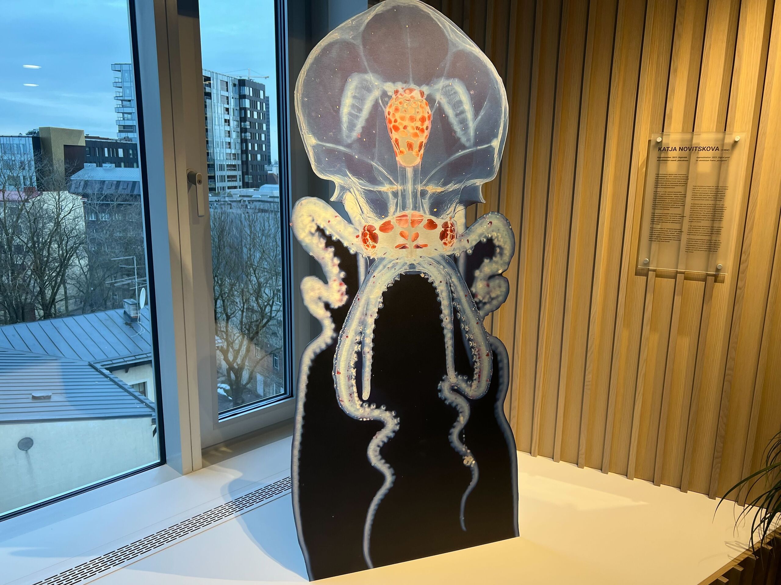 Katja Novitskova teostest kaunistab meie vastuvõttu teos „Approximation“ (2023) (digitrükk alumiiniumist raamil, pleksiklaas). Kunstnik alustas oma teostesarja „Approximations“ 2012. aastal ning täiendab seda pidevalt. Sarja kuuluvad fotoskulptuurid kujutavad suurendatud loomi, linde ja teisi elusolendeid, mis on kujundatud alumiiniumraamile. Mitmed neist kujutistest on pärit interneti otsingumootoritest.