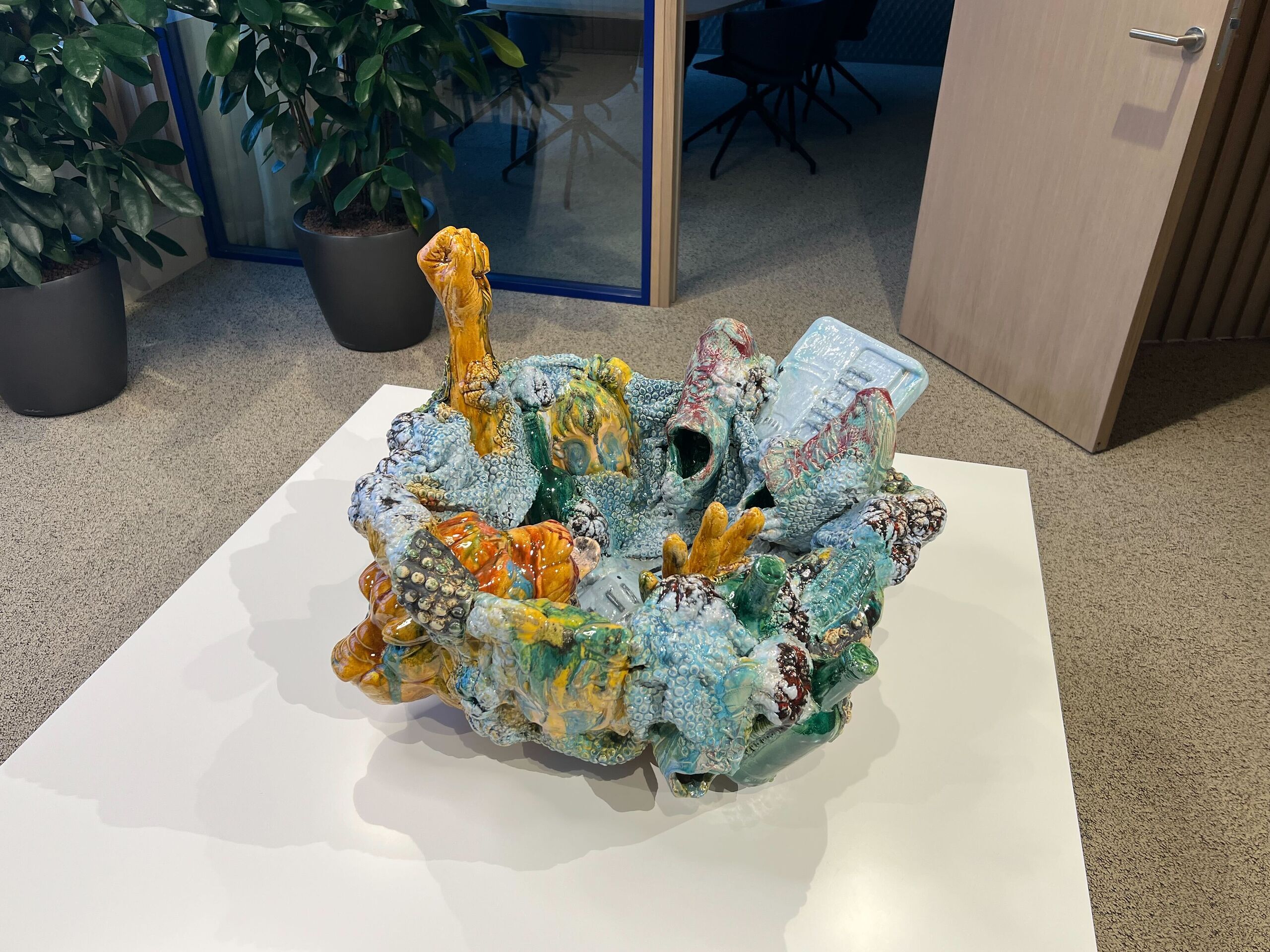 Kris Lemsalu keraamika „Moo-Pa“ (2021) on justkui kontsentreeritud annus Kris Lemsalu loomingut. Väiksele pinnale on toodud kokku tegelased ja objektid mitmest teosest. Kunstnik muudab oma kireva elu ja tegemised oma kunsti osaks, nii jõuavad tema keraamilistesse vormidesse sõprade kingitused, reisidelt juhuslikult kaasa ostetud näiliselt vähetähtsad esemed, emotsionaalsed leiud jms. Tema visuaalne keel on sürrealistlik ja lopsakas.