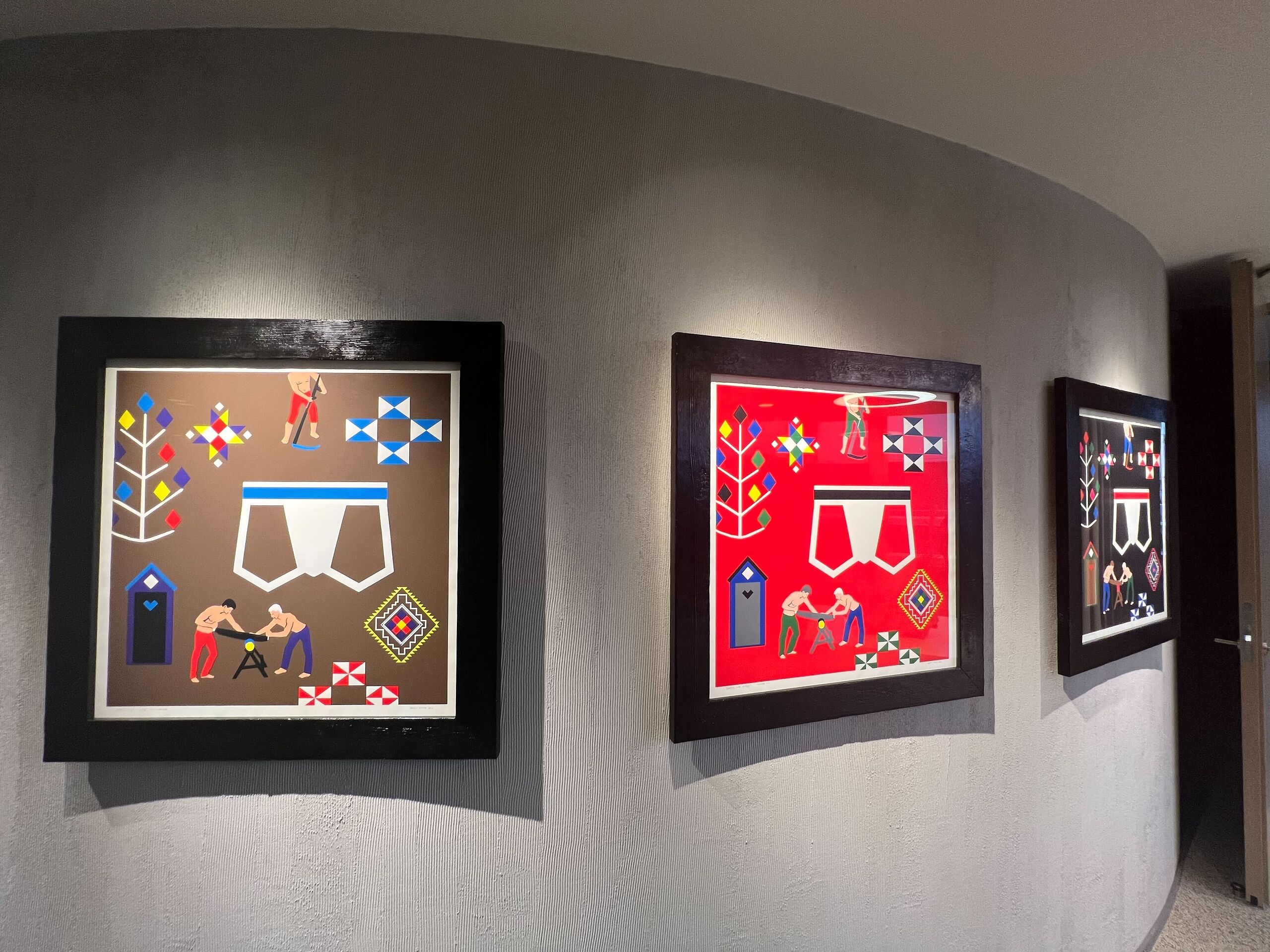 Jaanus Samma teostest on üleval kolm teost tema graafikaseeriast nimedega „Jockstrap sinise värviga“, „Jockstrap musta värviga“, „Jockstrap punase värviga“ (2021). Tema graafikaseeria ühendab geikultuuri sümbolid ja käsitöö traditsioonilise ikonograafia.